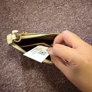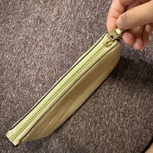 Two credit card slots Zip-top closure. Crocodile embossed leather and smooth leather Fabric lining. Only used twice. Zipper works like its brand new! No scratches!