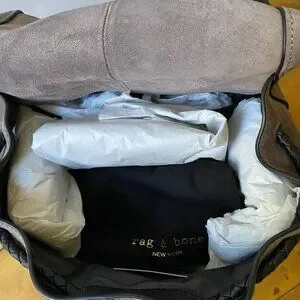 Gorgeous never been worn rag & bone suede backpack. Gray/ brown suede, black leather straps and tassels, silver zips and hardwear. Multiple pockets with zippers within for storage. Folds up or down to allow for different amounts of carrying capacity. Comes with authentication card and protective bag.