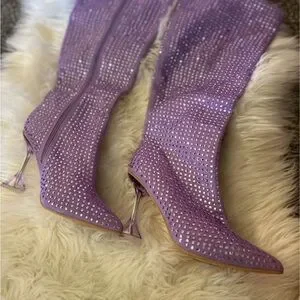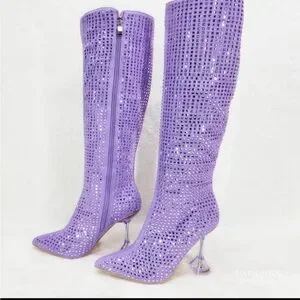 Dazzling purple boots with sparkling details. Features a chic clear heel. Ideal for a standout style.