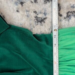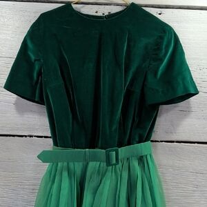 Charming vintage green velvet and chiffon dress featuring a fitted velvet bodice, matching belt, and full pleated chiffon skirt. This piece captures a classic mid-century silhouette — elegant yet playful. Perfect for holiday parties, retro events, or vintage collectors.