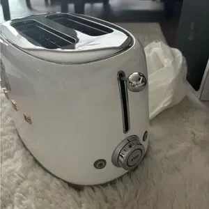 Enhance your kitchen with the stylish Smeg toaster in white with elegant gold accents. Perfect for toasting your favorite breads with a touch of luxury.