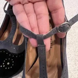 The shoe features a stylish two-tone design in soft faux gray suede (or nubuck) and black velvet.