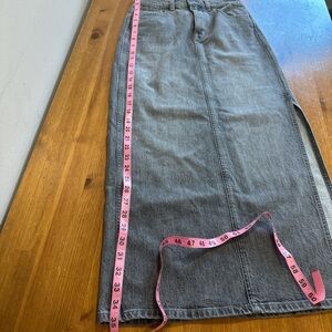 Stylish stonewash gray maxi skirt. Features a sleek design with a side slit. Perfect for versatile wear.