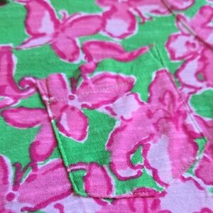 Hello, I am selling some gently used clothing. This listing is for a Lilly Pulitzer polo dress. Dress has bright colors of greens and pinks. Fabric is close to tshirt material but a bit more thin. Dress has no flaws, in excellent condition.
