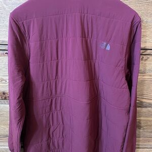 The North Face Women’s Mountain Sweatshirt Pullover 3.0 in Deep Garnet Red / Picante Red interior. Lightweight, warm, and perfect for layering in fall and winter. Features a half-zip front, quilted insulation, soft lining, and zip pockets.