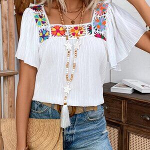 White Boho Women's Crochet Patchwork Square Neck Flutter Sleeve Vacation Shirt
