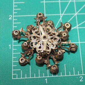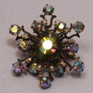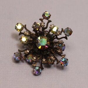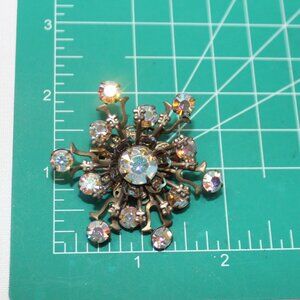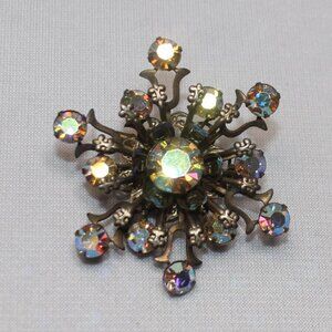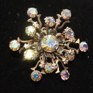 Beautiful unsigned vintage snowflake brooch. Gold tone setting with sparkling aurora borealis rhinestones. No damage or missing stones and clasp works well. Please see photos.