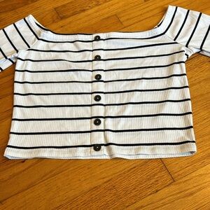 Express Off The Shoulder Top. Express x Olivia Culpo. Stripe black and white, size M. Minor peeling see photos.