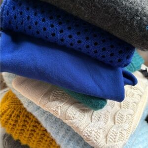 A vibrant collection of 9 knit sweaters in various colors. Perfect for adding a pop of color to your wardrobe.