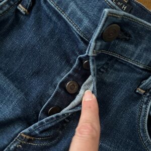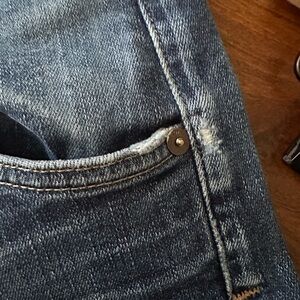 Upgrade your wardrobe with these classic blue denim jeans. Perfect for any casual occasion, these jeans offer both style and comfort. Button fly. Cotton blend denim. A few minor distressed wear marks on back pockets.