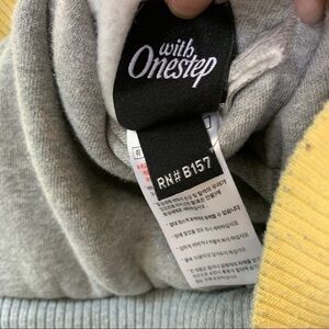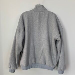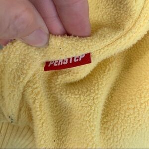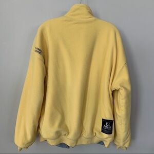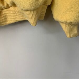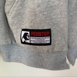 Sweatshirt material and fleece, heavier material, pockets, stronger 1990’s, evolution begins with one step, some pilling, in great condition!