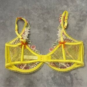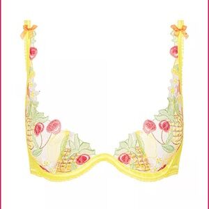 Beautiful bright yellow underwire bra with cherries and pineapples embroidered in the lace.
