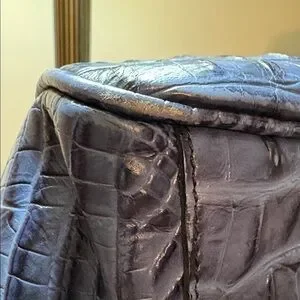 Elegant blue satchel with crocodile texture. Features gold hardware. Perfect for sophisticated style. See all pictures as part of description