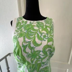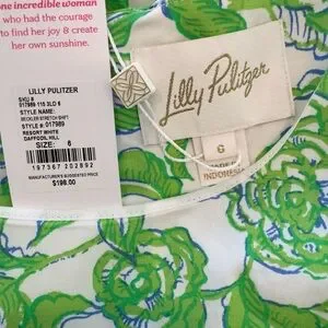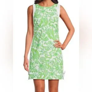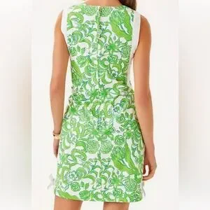 NWT Lilly Pulitzer Sz 6 Beckler Stretch Shift Dress Resort White Daffodil Hill. Chic iconic style sleeveless shift dress with vibrant green and blue floral design. Straight fit crew neck shift. Fits against the body at the chest and hips with more room at the waist.