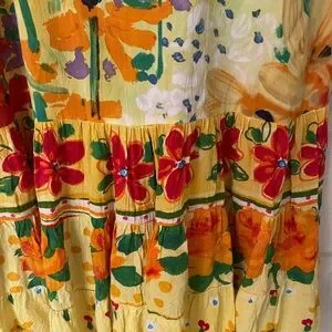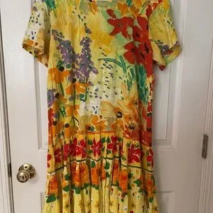 Jams World multi-color cotton, short sleeve, scoop neck swing dress with flounced hem. Bright yellow, green, red, orange and purple make for a super fun dress to wear. Comfortable and perfect for summer/beach. 18 inches pit to pit. Labeled large but fits more like a medium. I got so many compliments in this beauty!