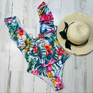 Floral Ruffled Monokini Plunging V-Neck Tie Back