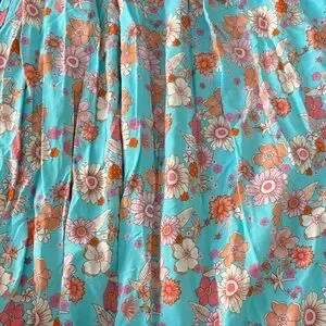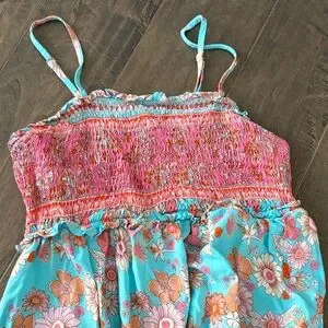 Vibrant floral maxi dress. Features turquoise and pink hues and adjustable spaghetti straps. Perfect for summer outings.