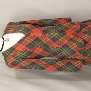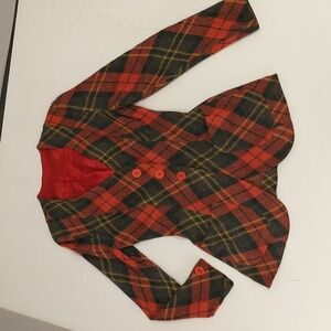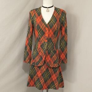Super cute & classy red plaid skirt set. Fitted blazer with short flirty A-line skirt. Very good condition, some light pilling - no stains or damage. Guessing it is acrylic, no content tag. Mysteriously the skirt tage says hand wash, jacket dry clean (could likely be carefully hand washed). Skirt waistband is split on one side, see the pic. Marked size 7, shown on a 6 dress form and a nice fit. Form is 35/26/36. Pit to pit on jacket 18", skirt waist 26", skirt length 18.75". Fabric has a little bit of natural stretch.