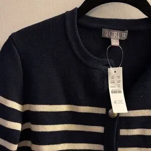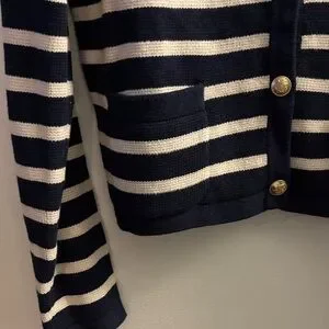Stylish navy and white striped cardigan featuring gold buttons. Perfect for layering. J.Crew Lady Jacket