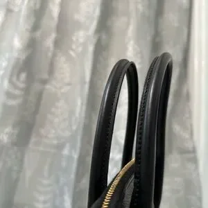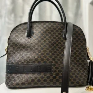 The bag is from the French luxury brand Céline and features the brand's iconic Macadam monogram pattern, which is a vintage design. The style of the bag, with its dome shape and top handles, is commonly referred to as a "Boston bag".