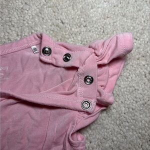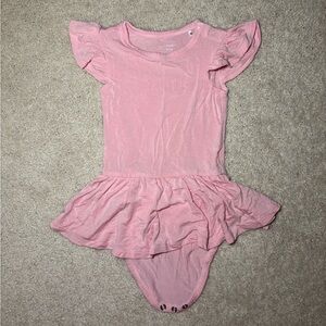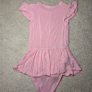 Charming pink bodysuit with ruffled sleeves and skirt. Ideal for fun outings.