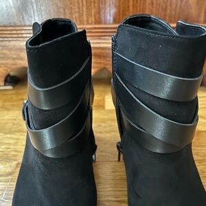 Material Girl Chic black suede ankle booties with moto straps and metal accents. Approx 3.25” heel. Zipper for easy on and off. Ideal for any occasion. Only worn once. Excellent pre owned condition. Has original box. All man made material.