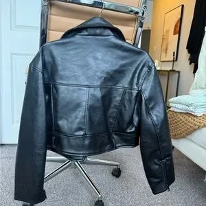 Chic black leather jacket by Lioness. Features a stylish cropped design. Perfect for a bold look. Belt not included.
