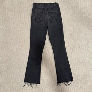 Mother Denim The Hustler Ankle Fray in Lighting Up Lanterns, size 24. High-rise bootcut with ankle-length inseam and raw hem. Crafted from soft stretch denim in a faded black/charcoal wash with whiskering and tonal hardware. Made in Los Angeles. Excellent used condition from a smoke-free home. A versatile, flattering laid-back silhouette perfect for everyday wear.