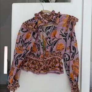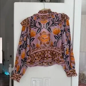 Step out in style with this elegant floral ruffle blouse. The vibrant pink and orange hues add a touch of sophistication to any outfit. Open back buttons at neck. Such a beautiful sophisticated bohemian style.