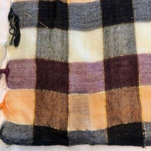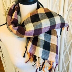 Forever 21 Scarf Square Buffalo Check Ivory Black Orange Metallic Thread Fringed
