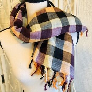 scarf fall square buffalo plaid check ivory off white black orange wine burgundy metallic casual accent fringe gold academia cottagecore