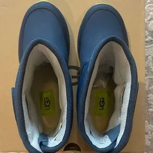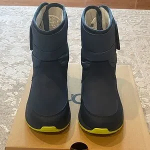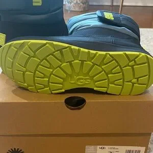 Stylish UGG boots for kids. Dark blue with bright green details. Perfect for warmth and comfort.