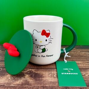 New in box. Add a touch of cuteness to your coffee routine with this limited edition Hello Kitty x Starbucks mug! Featuring Hello Kitty in an adorable Starbucks apron, this ceramic mug brings a smile to every sip. The deep green handle complements the iconic Starbucks color, while the matching lid keeps your drink warm and splash-free.