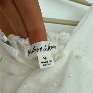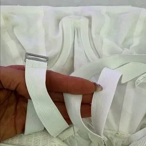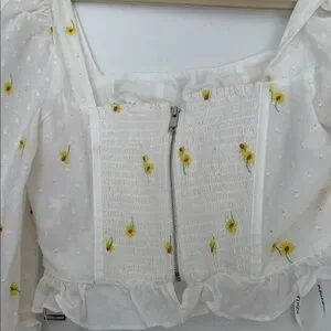 This elegant white blouse features charming floral accents, perfect for adding a touch of sophistication to your wardrobe. Sexy, underwire bra and elastic the back for a perfect fit. Elastic shop so you can secure your body. There are tiny black fuzzies on the shirt. I am sure they will come out once cleaned. You can see in the photos. It is not noticeable.