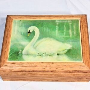 A musical jewelry box featuring a swan on a unique Graphic Art Tile by Kimberly Enterprises. Like new condition. Does not look used. The song played is Over the Rainbow. A beautiful song from the late 1960’s. The box measures approximately 7.25”x 5.5”x 2.25.”