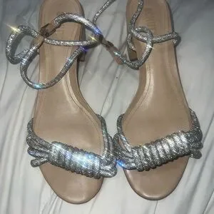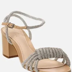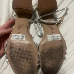Step into elegance with SCHUTZ's stunning heels, showcasing a shimmering silver strappy design and a chic tan block heel. These shoes offer a secure fit with an ankle strap and buckle closure, making them perfect for any dressy occasion.