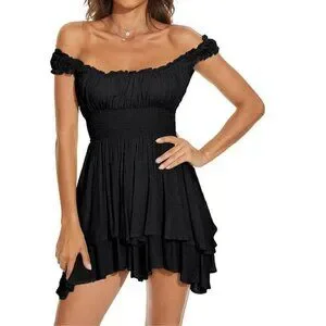 Flirty and feminine, this FOROLAV Off Shoulder Flowy Romper is perfect for warm weather outings. It features a lined bust with a square neckline, ruffle detail along the neck and shoulders, an elastic waist for a flattering fit, and a flowy bottom for breezy comfort. Can be worn on or off the shoulder for a versatile look.