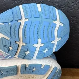 Stylish Brooks athletic shoes for women. Features a blue and pink design. Ideal for running and workouts.