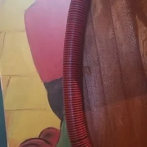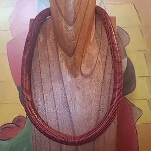 Handcrafted African Vinyl Vulcanite Necklace. Also known as Jijida beads, hold cultural significance. Vulcanite beads, known as vinyl beads, are thin colorful discs shapes that are traditionally made from vulcanized rubber or, more recently vinyl. Red and Black. 13 1/4 in. long. Made in Africa. In excellent condition.
