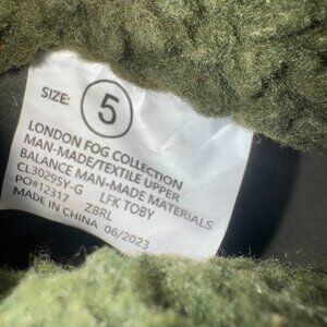 The London Fog Toby Boys Youth Snow and Rain Boots in size 5 feature a round toe, lace-up closure, and mid-calf shaft height, making them perfect for casual occasions during the winter season. These insulated boots are lined with fleece, have an adjustable closure, and are waterproof, making them ideal for outdoor activities in snowy and rainy weather. The stylish design with a dinosaur theme and solid green color adds a fun touch to the durable rubber outsole, making them a must-have for any young adventurer.