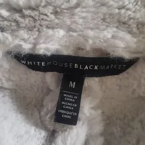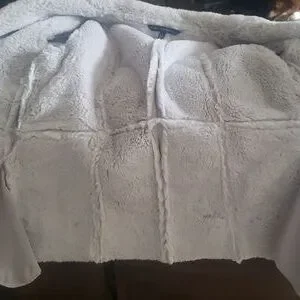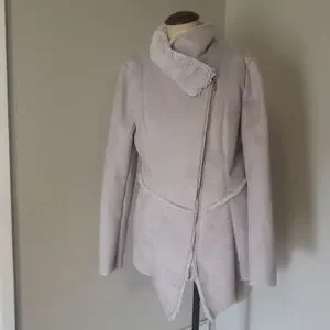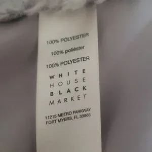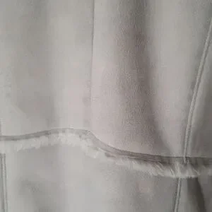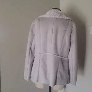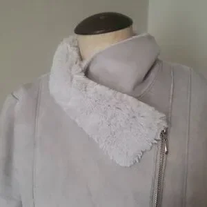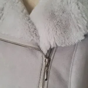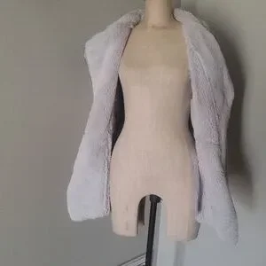 This is the most beautiful 100% polyester faux fur coat I have seen. It is silver faux suede, and silver faux fur. it has the most beautiful, heavy silver angled zipper. There are deep, side slit pockets too. It is longer in the front than in back. It doesn't fit me,, so it runs small, so check measurements. This is machine washable, and has been washed. It is preowned. Pit to pit 20", length from shoulder to hem (front) is 27.5", length back 25.5", width from shoulder to shoulder (back) 17", arm length 24.5, and back hip side to side is 24".