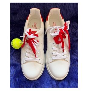 Crafted from smooth white leather with bold red accents at the heel and tongue, these sneakers feature both white and red laces, plus a removable mini tennis-ball charm for a fun finishing touch.