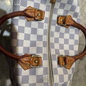 Iconic Damier Azur Speedy 30 design by Louis Vuitton. Excellent pre loved condition. Normal signs wear throughout. Zipper pull is torn. Comes with multi pocket zipper insert and unbranded leather strap. Large LV dust bag included.