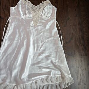 Luxurious ivory satin chemise with intricate lace detail. Soft and elegant design. Ideal for a stylish night's sleep.