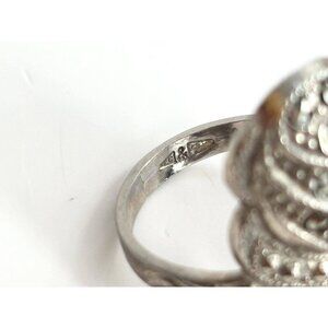 Art deco style rosebud foliage ring. The ring has round cut marcasite gemstones set along the front. The inner shank is stamped with C&C, indicating it's made by Clark & Coombs. Unmarked in terms of sterling but it tested positive as such via chemical testing. Band is tapered.
