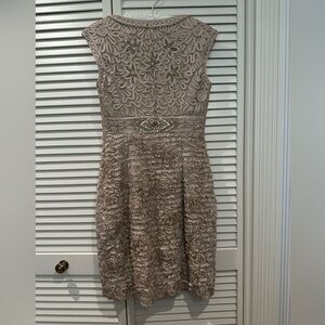 Stunning and in excellent condition , this Sue Wong couture style “Nocturne” cocktail dress is a timeless beauty with a beaded waistline and cap sleeves and a skirt adorned with rosettes and ribbons. Its champagne color is the perfect hue to highlight the intricate details!