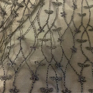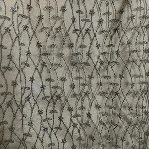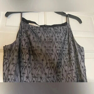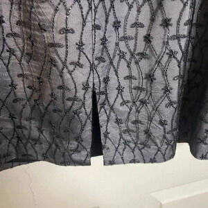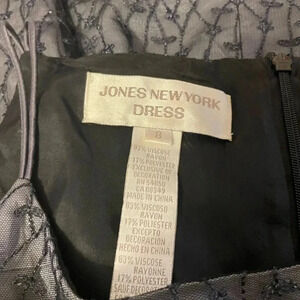This stunning Jones New York sheath dress is the perfect choice for any formal occasion. The gray color dress is covered by a fine sheer black net that is embroidered with a floral vine pattern of intricate beading, adding a touch of elegance to the knee-length dress. The sleeveless design and straight neckline provide a classic look, while the zip closure ensures a secure fit.