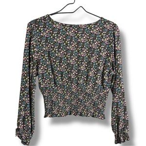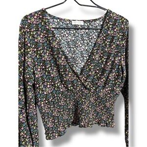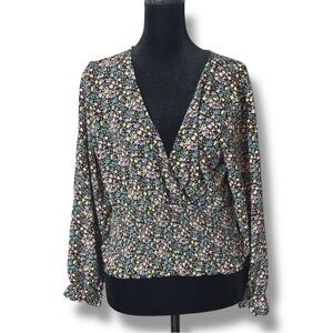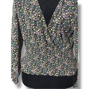 Paper Crane Black with Vibrant Pink and Yellow Floral Long Sleeve Wrap Blouse