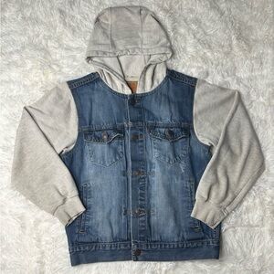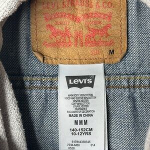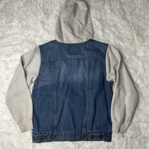 Classic Levi's denim jacket. Features gray sleeves and hood. Ideal for everyday wear. Good condition.
