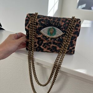 Stylish leopard print bag with eye embellishment. Features a chic chain strap for versatile wear. Perfect for adding a bold statement to any outfit.
